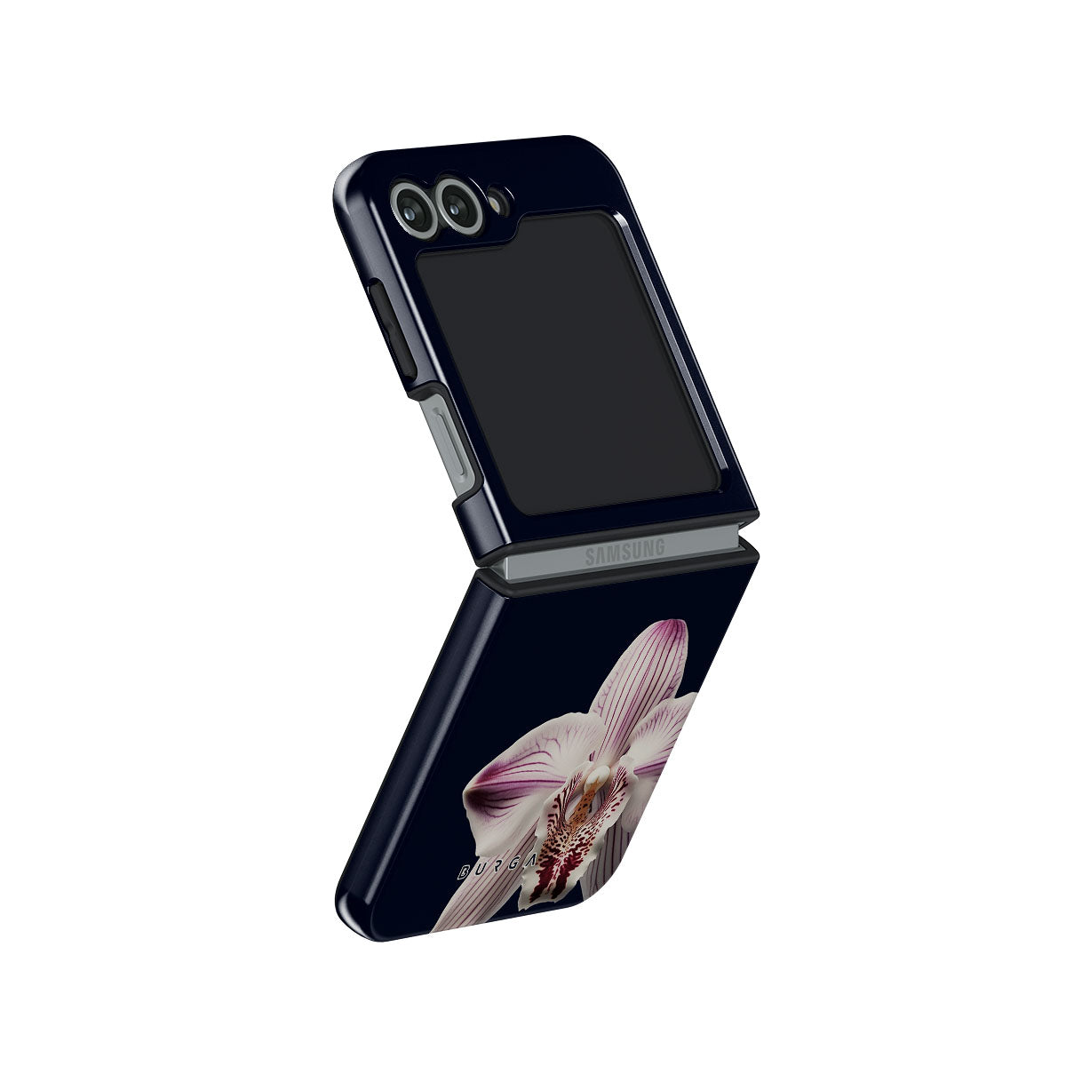 The white orchid blooms boldly upon a night sky blue, a beacon of clarity in the darkness. Our Nectar Samsung Galaxy Z Flip 6 phone case design speaks to the soul's desire to find light within, to illuminate the hidden paths of self-discovery that only reveal themselves under the cloak of introspection.