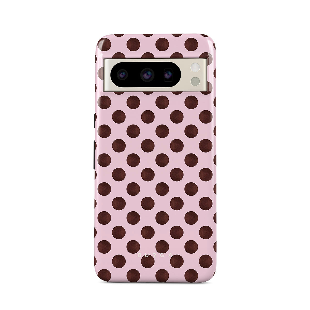 This design features: a retro polka dot pattern, pink background with brown polka dots.