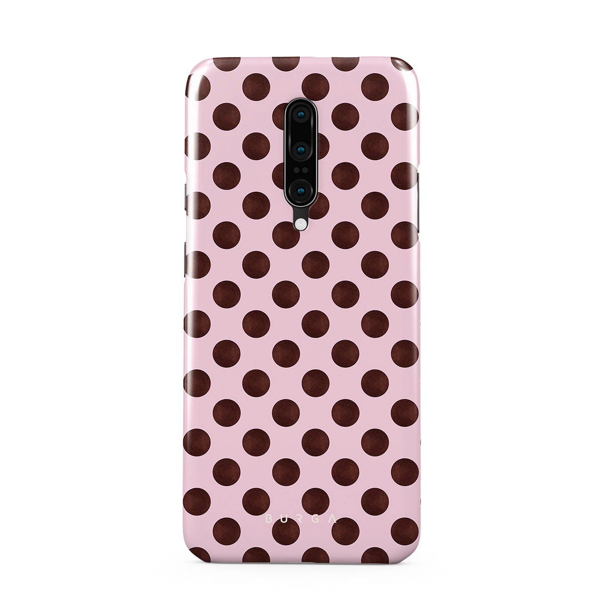 This design features: a retro polka dot pattern, pink background with brown polka dots.