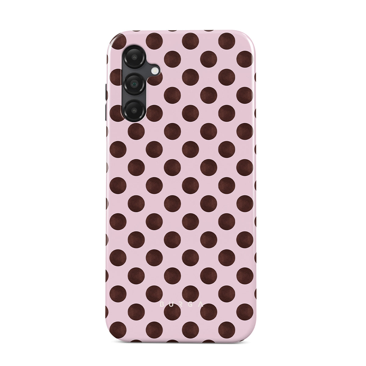 This design features: a retro polka dot pattern, pink background with brown polka dots.