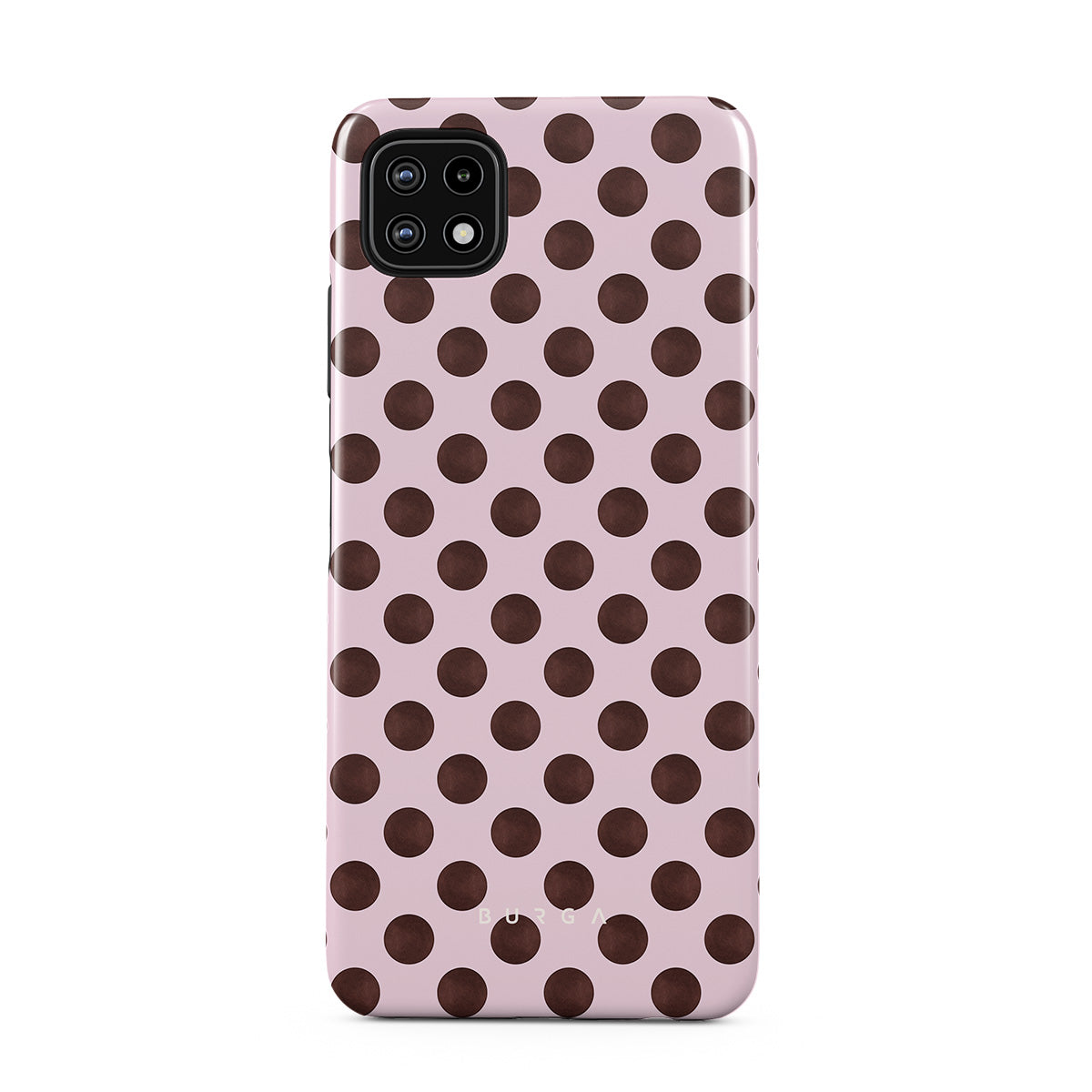 This design features: a retro polka dot pattern, pink background with brown polka dots.