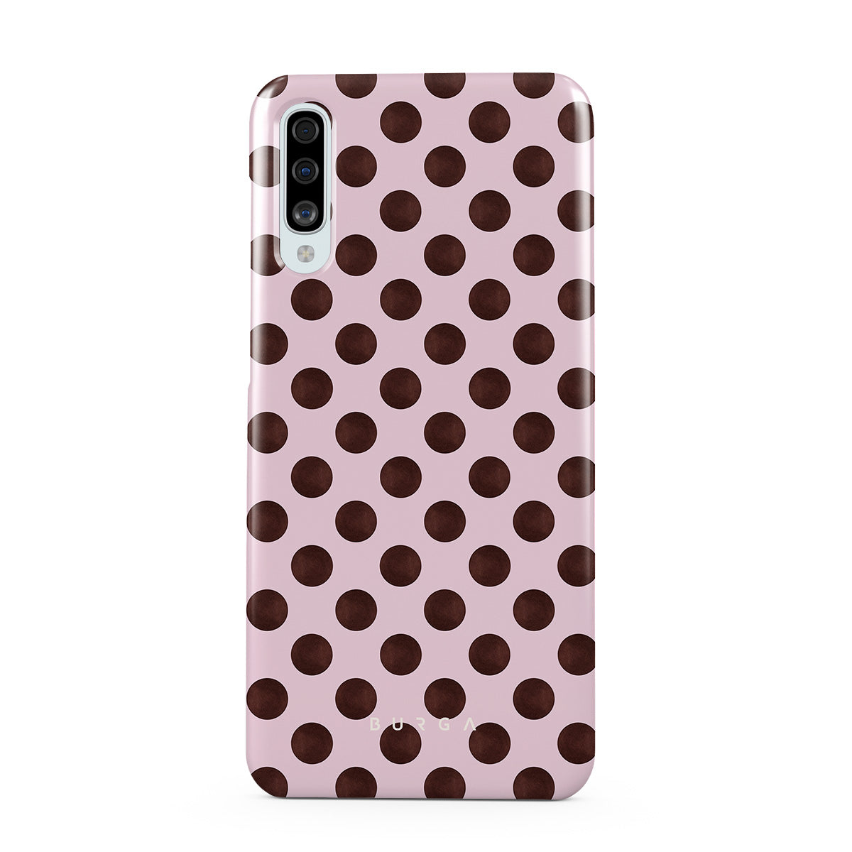 This design features: a retro polka dot pattern, pink background with brown polka dots.