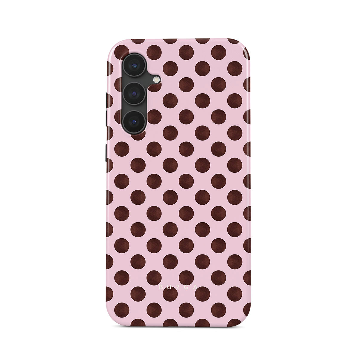 This design features: a retro polka dot pattern, pink background with brown polka dots.