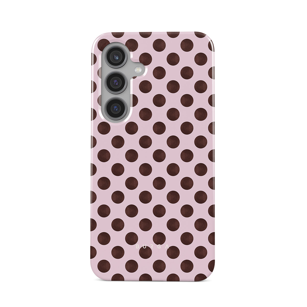 This design features: a retro polka dot pattern, pink background with brown polka dots.