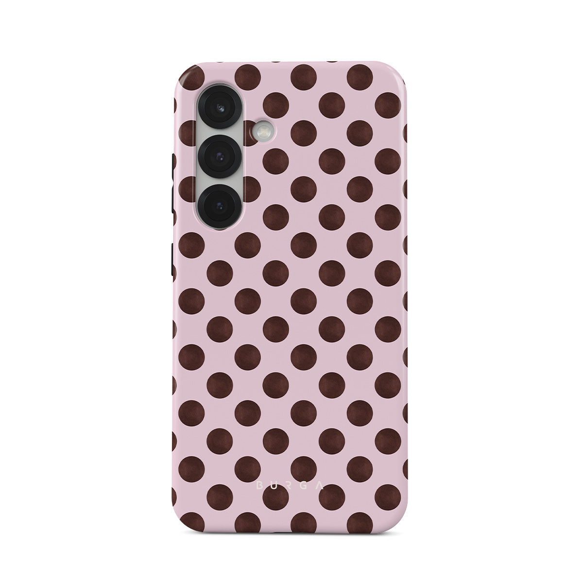 This design features: a retro polka dot pattern, pink background with brown polka dots.