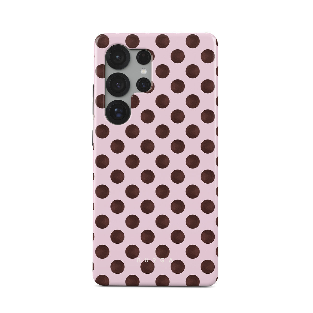 This design features: a retro polka dot pattern, pink background with brown polka dots.