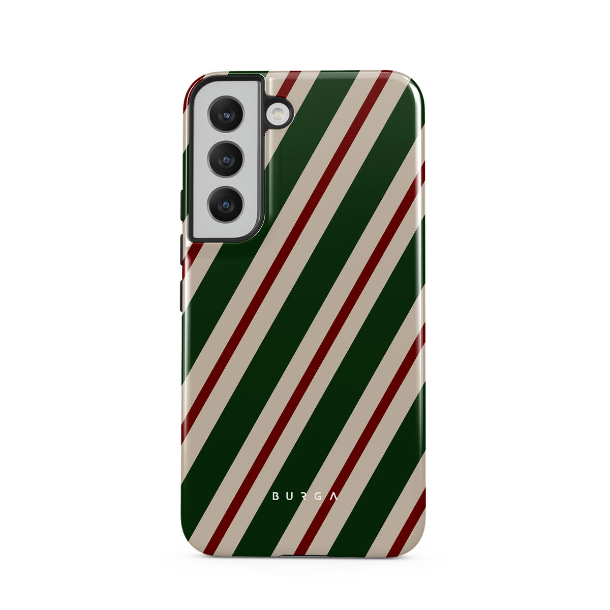 A joyful design that screams holiday spirit. Our North Pole Samsung Galaxy S22 Case phone case transports you straight to Santa's workshop. Bold green, red, and white stripes echo the joy and laughter of elves preparing for the festive season.