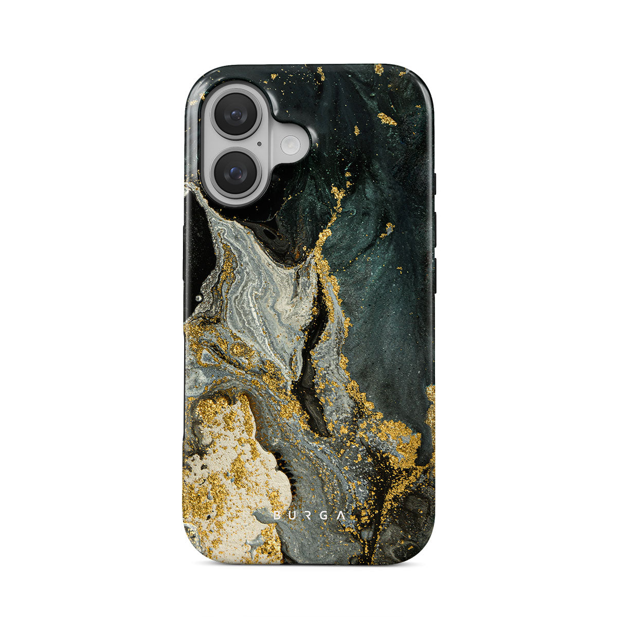 Our cute marble Northern Lights iPhone 16 Plus phone case showcases a combination of moss green shades in a marble pattern enriched with golden specks. The asymmetrical design reminding of a star map will add a touch of luxury and mystery to every accessory lover's collection.
