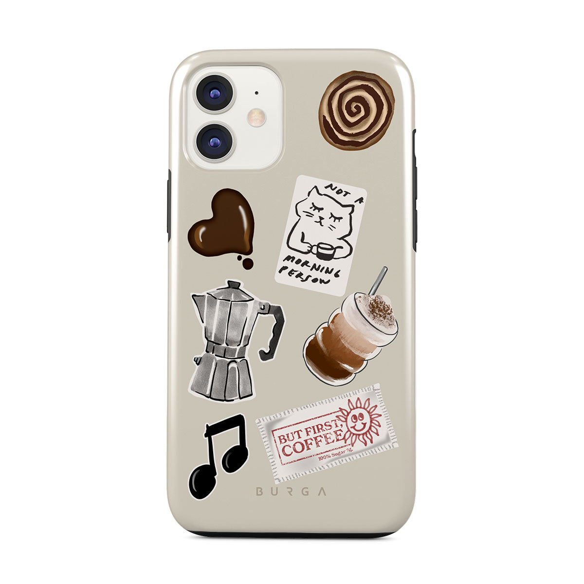 This design features: moka pot, frappe, cinnamon roll, chocolate heart, "Not a morning person" sticker, "But First, Coffee" receipt, music note