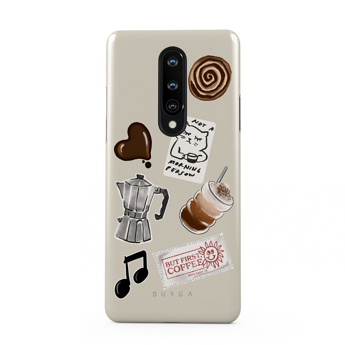 This design features: moka pot, frappe, cinnamon roll, chocolate heart, "Not a morning person" sticker, "But First, Coffee" receipt, music note