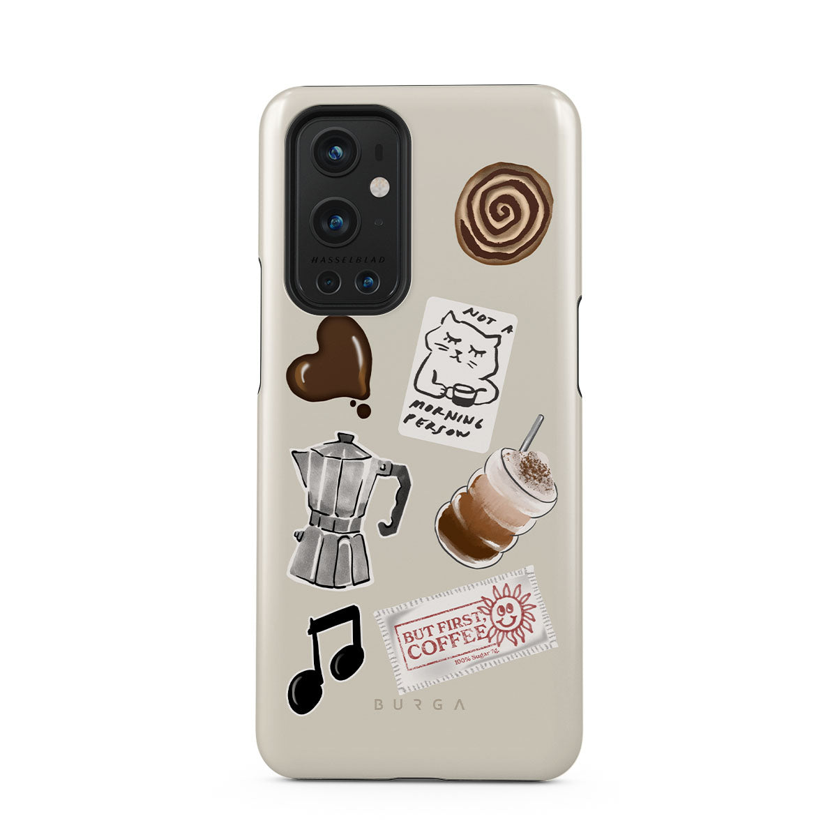 This design features: moka pot, frappe, cinnamon roll, chocolate heart, "Not a morning person" sticker, "But First, Coffee" receipt, music note