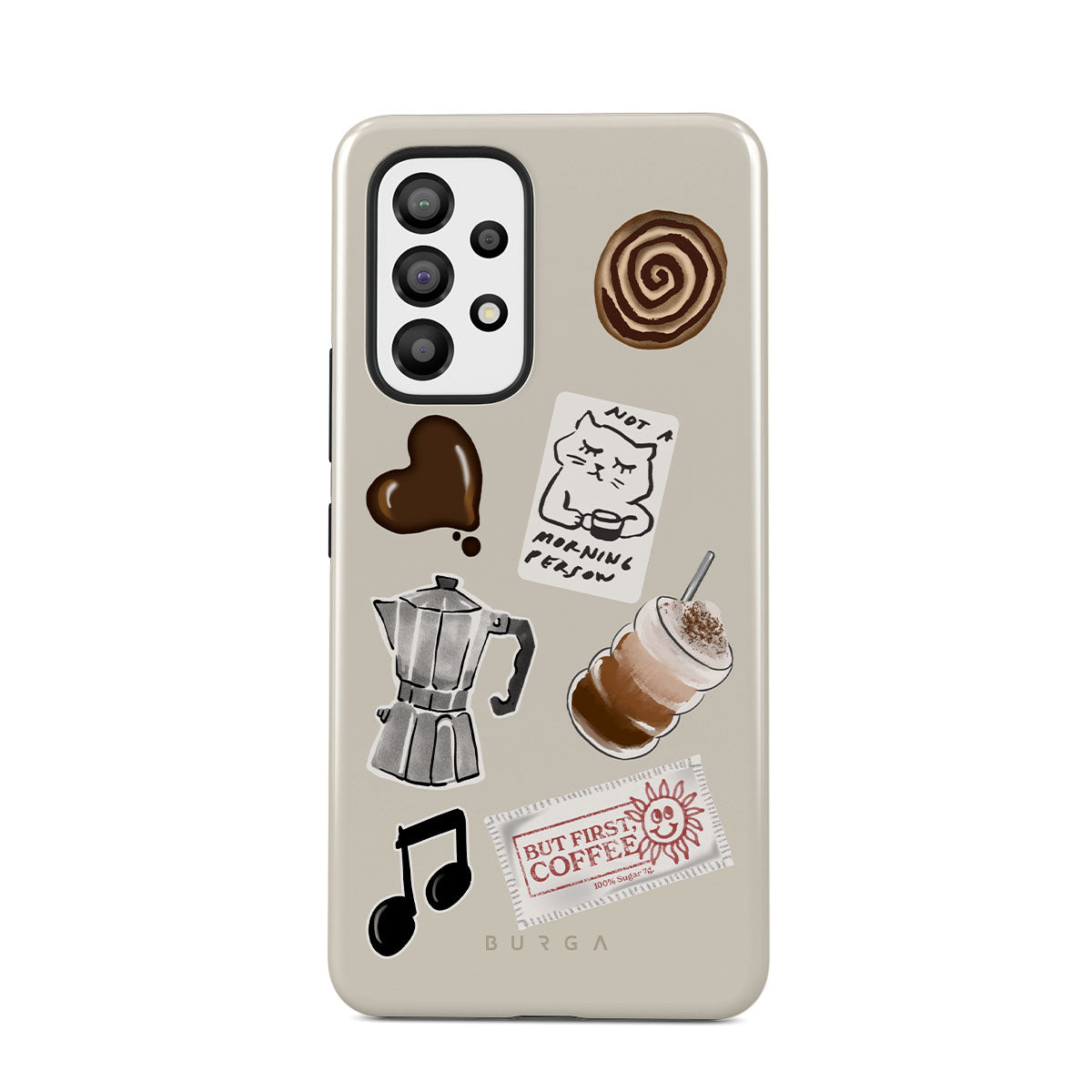 This design features: moka pot, frappe, cinnamon roll, chocolate heart, "Not a morning person" sticker, "But First, Coffee" receipt, music note