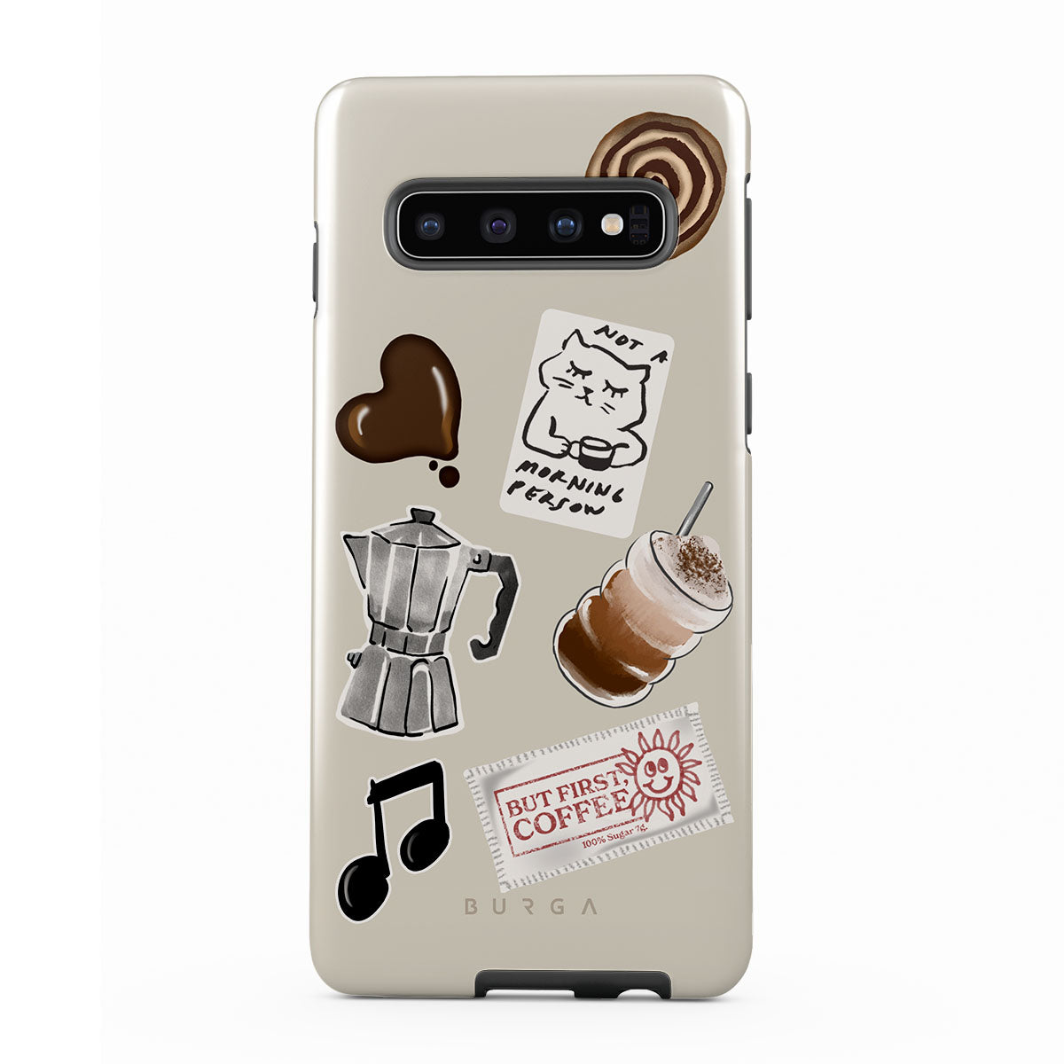 This design features: moka pot, frappe, cinnamon roll, chocolate heart, "Not a morning person" sticker, "But First, Coffee" receipt, music note