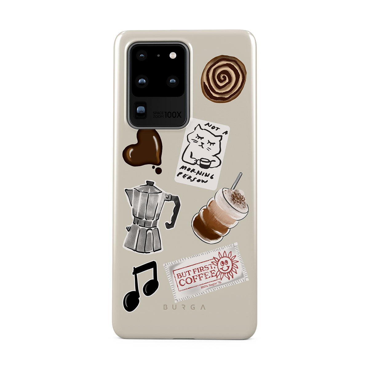This design features: moka pot, frappe, cinnamon roll, chocolate heart, "Not a morning person" sticker, "But First, Coffee" receipt, music note