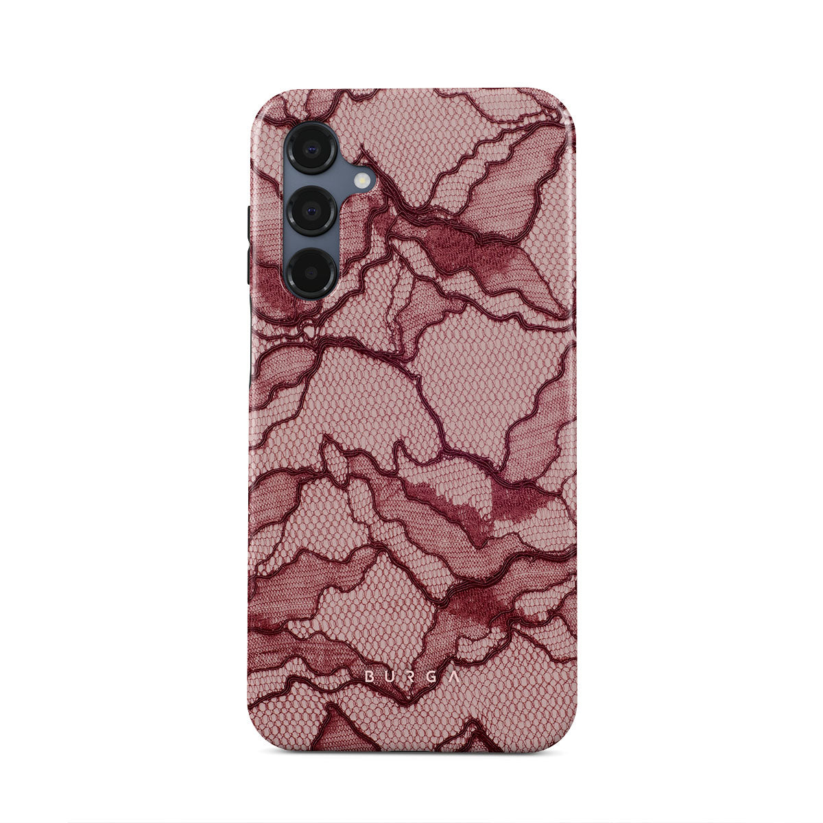 Channel your inner power with our Office Siren Samsung Galaxy A16 phone case design. A soft rosé backdrop and dark pink lace blend elegance and boldness, perfect for those who make quiet yet undeniable statements with confidence.