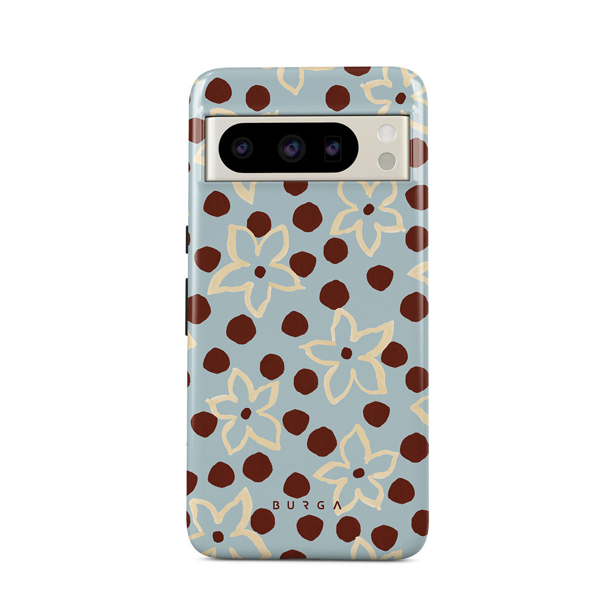 The Frutaria Google Pixel 8 Pro phone case design design: retro surf motel wallpaper meets vintage ceramics. The soft florals, earthy dots, and cool-toned palette give major “forgotten seaside town in the ‘70s” energy.