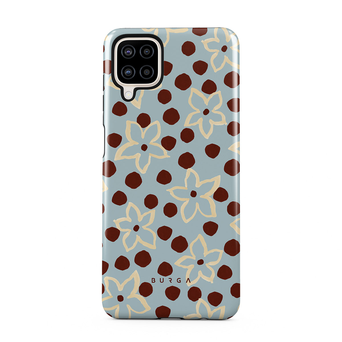 The Frutaria Samsung Galaxy A12 4G phone case design design: retro surf motel wallpaper meets vintage ceramics. The soft florals, earthy dots, and cool-toned palette give major “forgotten seaside town in the ‘70s” energy.