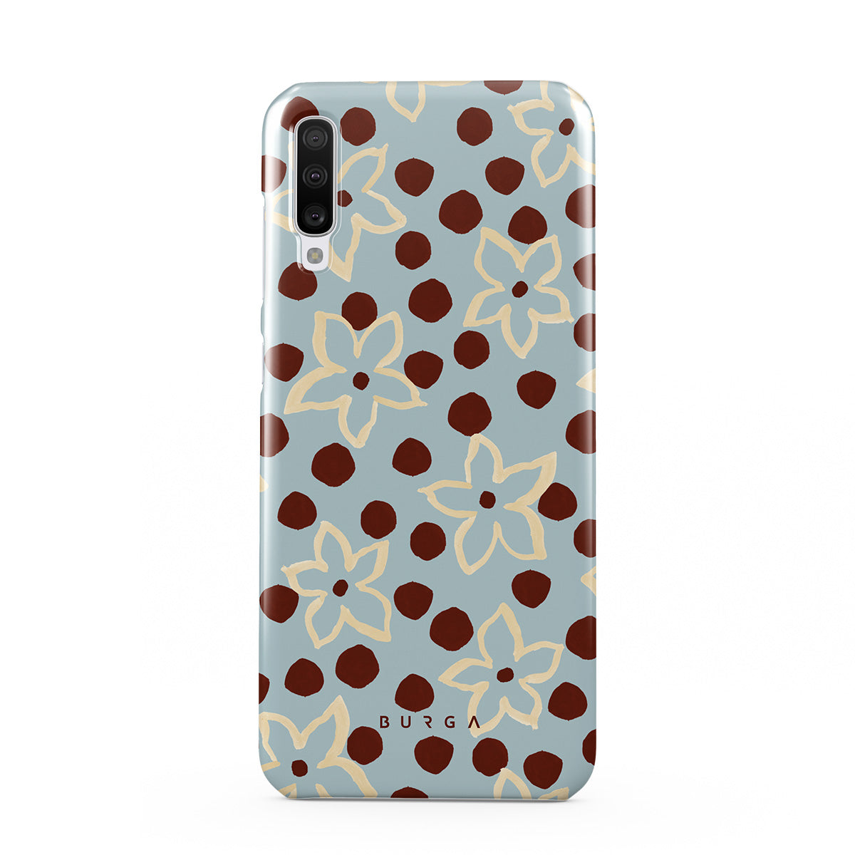 The Frutaria Samsung Galaxy A70 phone case design design: retro surf motel wallpaper meets vintage ceramics. The soft florals, earthy dots, and cool-toned palette give major “forgotten seaside town in the ‘70s” energy.