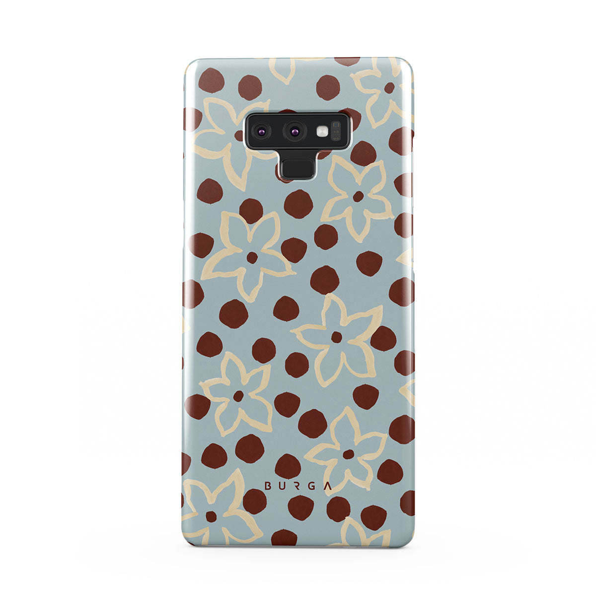 The Frutaria Samsung Galaxy Note 9 phone case design design: retro surf motel wallpaper meets vintage ceramics. The soft florals, earthy dots, and cool-toned palette give major “forgotten seaside town in the ‘70s” energy.