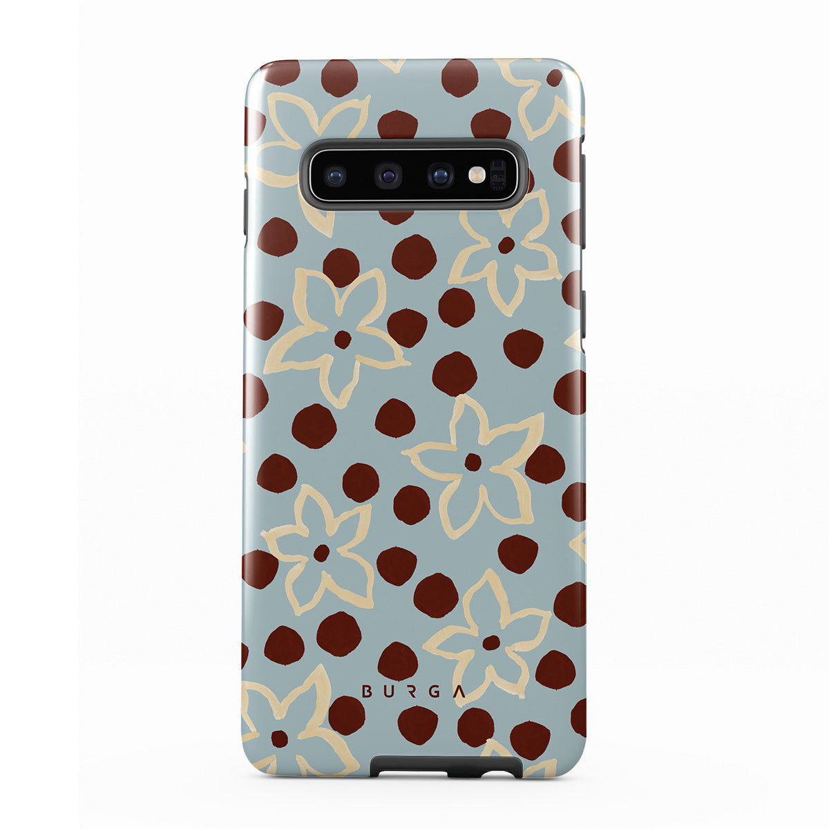 The Frutaria Samsung Galaxy S10 4G phone case design design: retro surf motel wallpaper meets vintage ceramics. The soft florals, earthy dots, and cool-toned palette give major “forgotten seaside town in the ‘70s” energy.