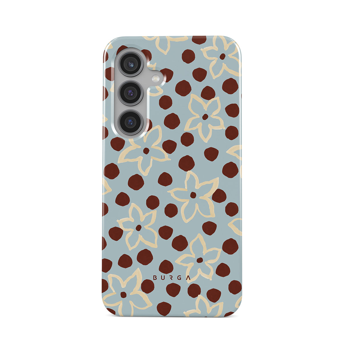The Frutaria Samsung Galaxy S24 FE phone case design design: retro surf motel wallpaper meets vintage ceramics. The soft florals, earthy dots, and cool-toned palette give major “forgotten seaside town in the ‘70s” energy.