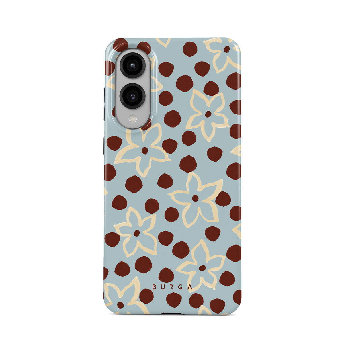 The Frutaria Samsung Galaxy S25 Edge phone case design design: retro surf motel wallpaper meets vintage ceramics. The soft florals, earthy dots, and cool-toned palette give major “forgotten seaside town in the ‘70s” energy.