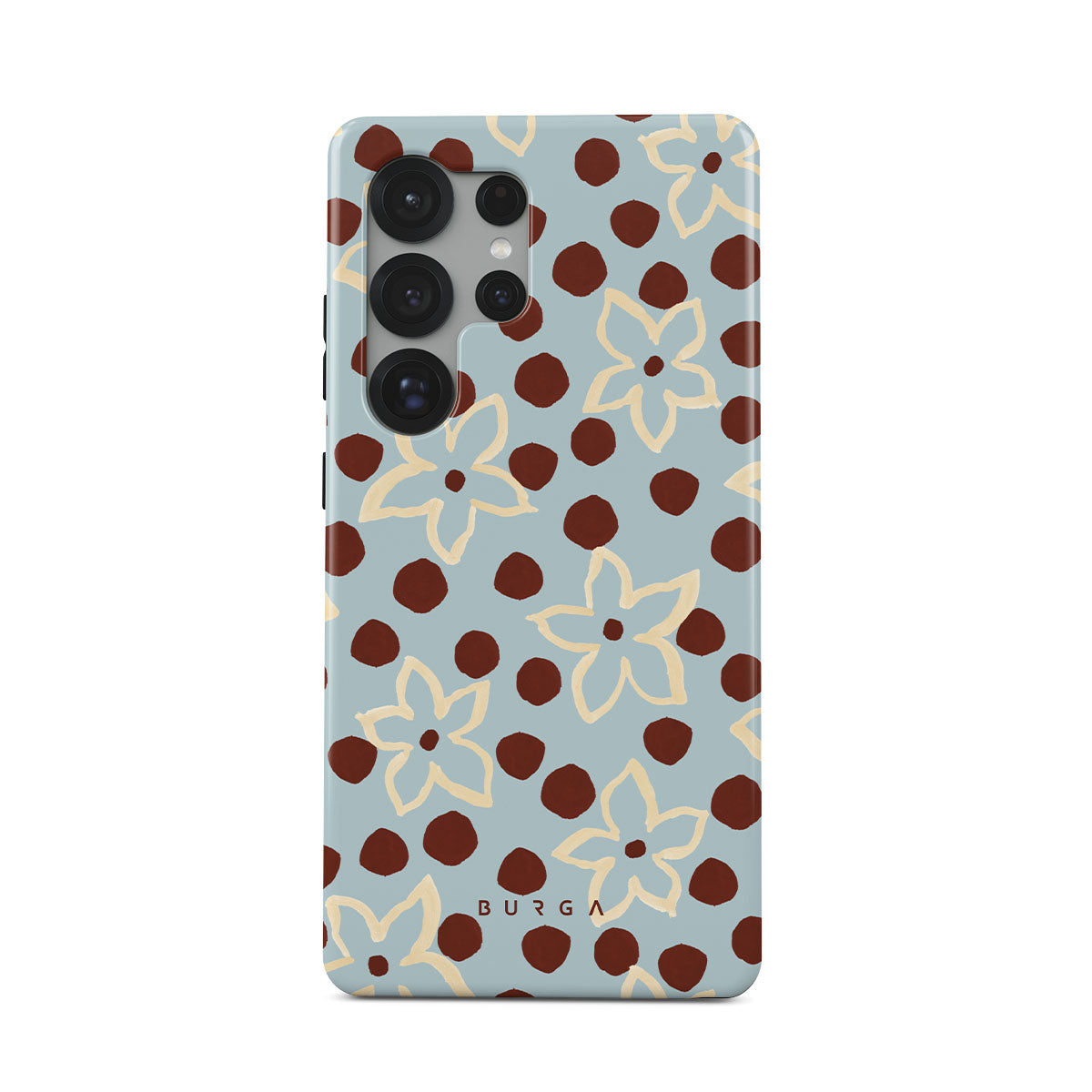 The Frutaria Samsung Galaxy S25 Ultra phone case design design: retro surf motel wallpaper meets vintage ceramics. The soft florals, earthy dots, and cool-toned palette give major “forgotten seaside town in the ‘70s” energy.