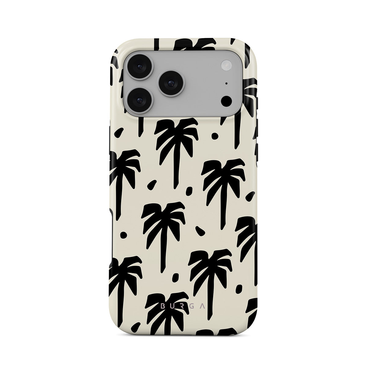 A peaceful haven right at your fingertips. The design contrasts black palm silhouettes against a calming light backdrop. Our Paraíso iPhone 17 Pro Max phone case is your passport to an everlasting tropical escape.