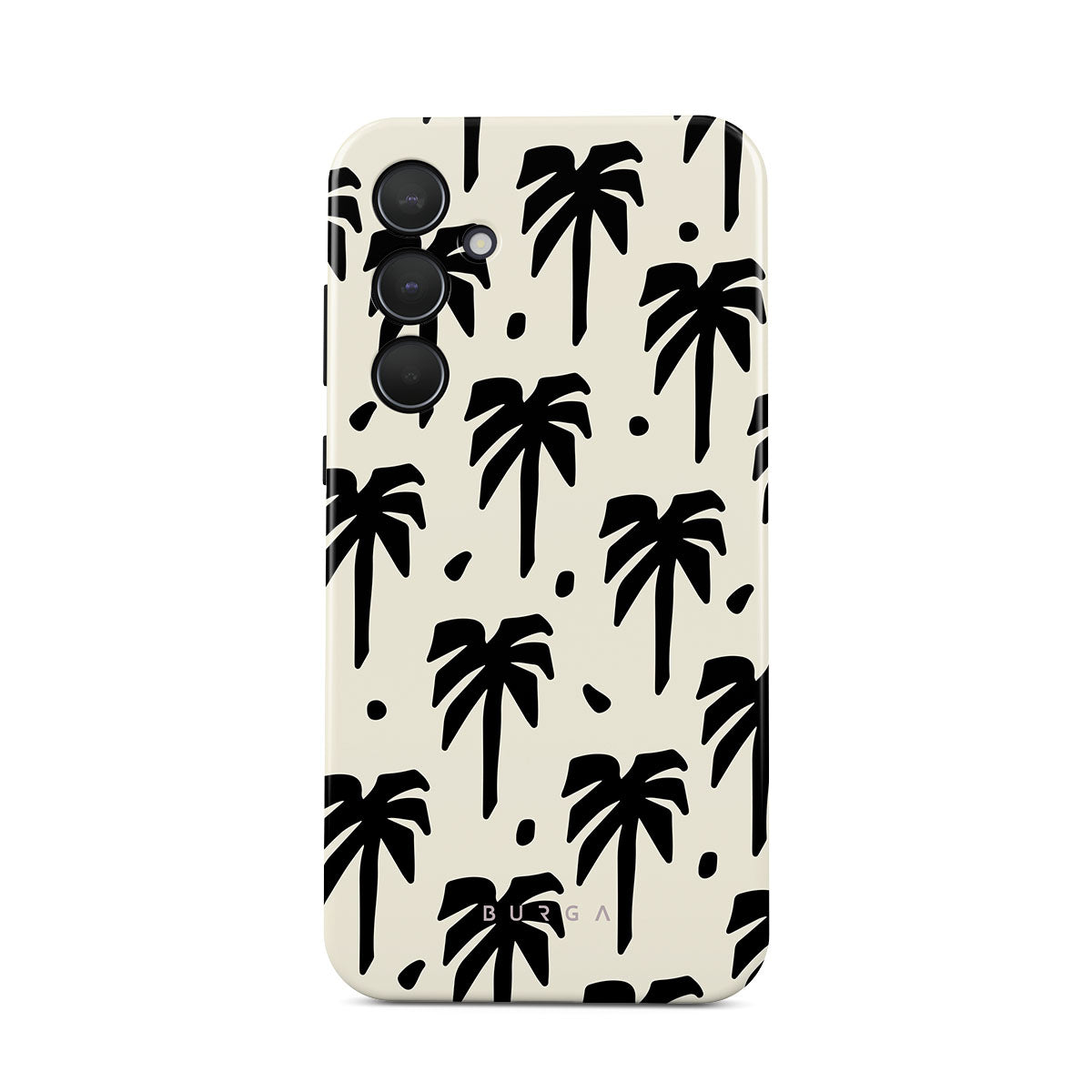 A peaceful haven right at your fingertips. The design contrasts black palm silhouettes against a calming light backdrop. Our Paraíso Samsung Galaxy A35 phone case is your passport to an everlasting tropical escape.