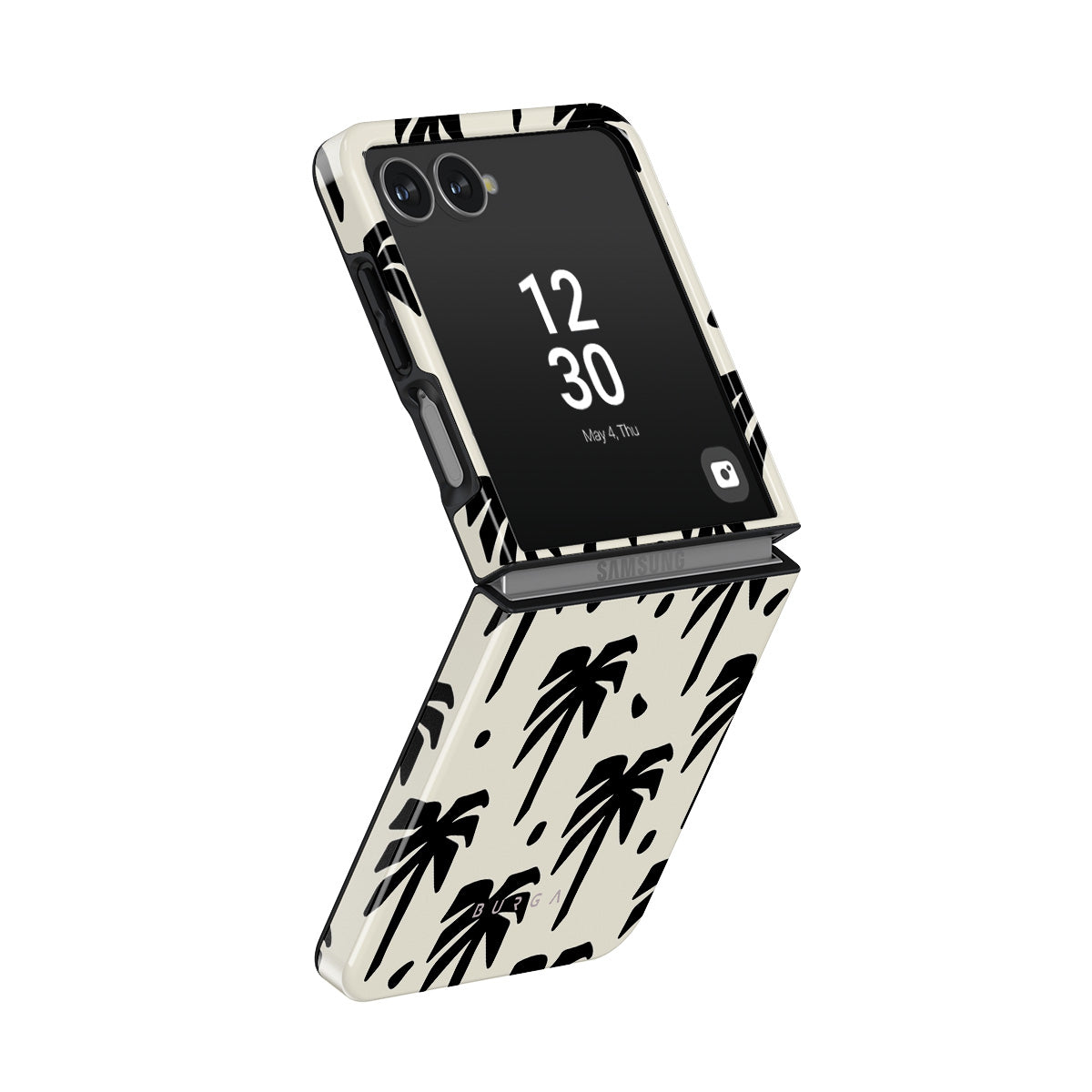 A peaceful haven right at your fingertips. The design contrasts black palm silhouettes against a calming light backdrop. Our Paraíso Samsung Galaxy Z Flip 7 phone case is your passport to an everlasting tropical escape.
