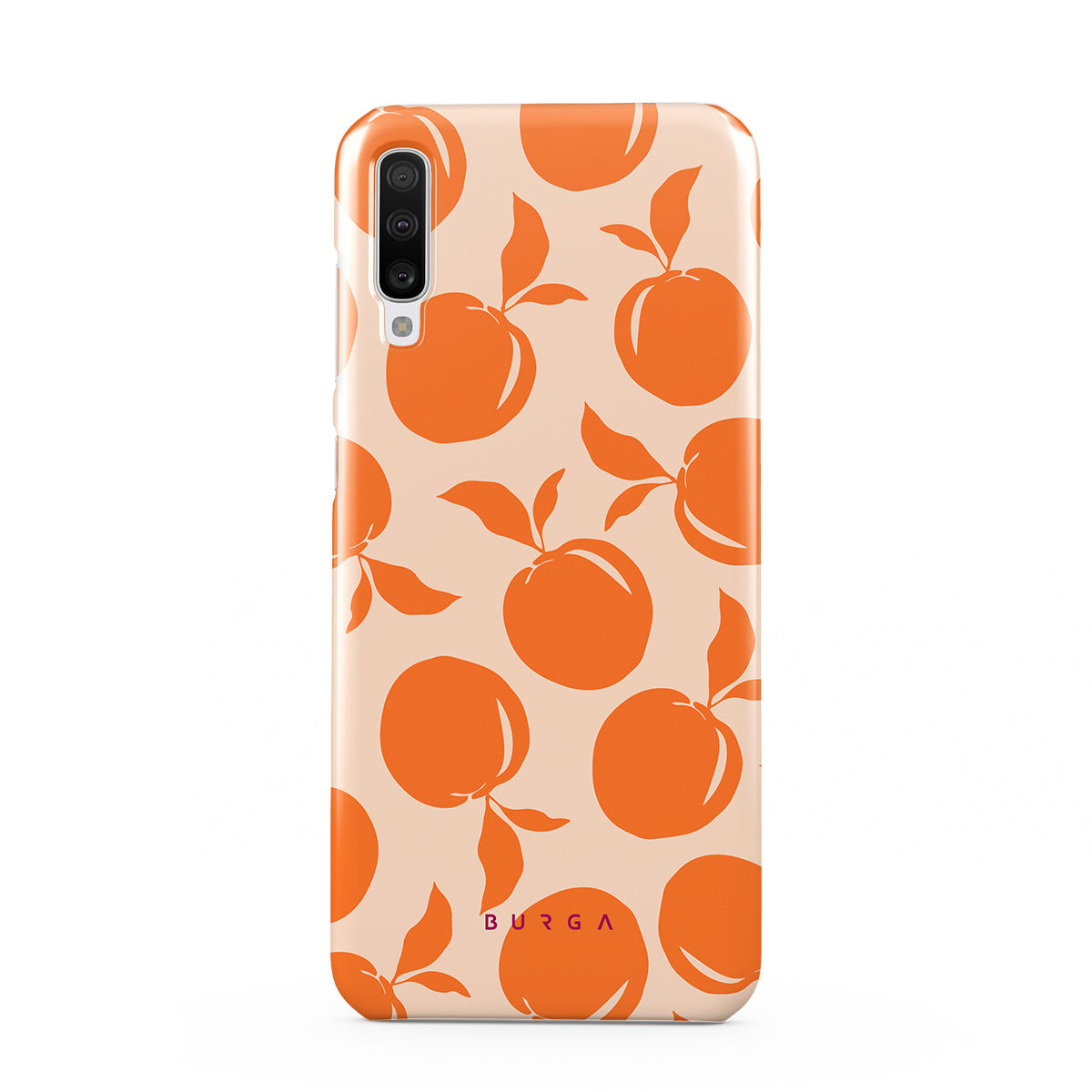 Picture a sun-soaked grove where ripe, juicy peaches glow with a radiant orange vibrance, their succulent aroma filling the warm air. Our Peach Fuzz design infuses your Samsung Galaxy A70 phone case with a lively, sun-kissed charm, perfectly capturing the essence of carefree, joyful summer days.
