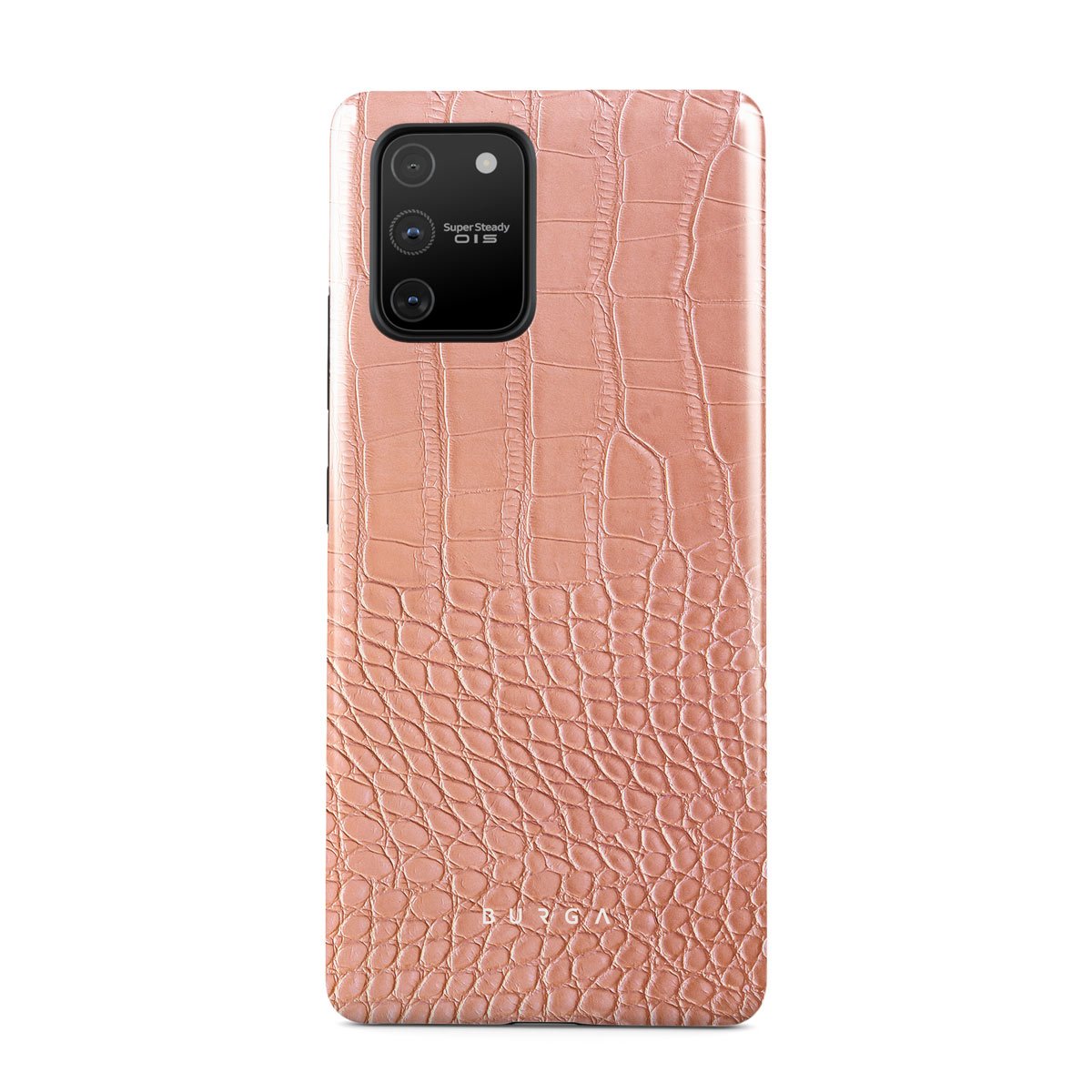 Our Pink Croco Samsung Galaxy S10 Lite phone case features a classic crocodile design reimagined and showcased in a soft coral shade. The new take on the dangerous animal print will add a touch of softness to your style while simultaneously offering heavy-duty protection to your device.