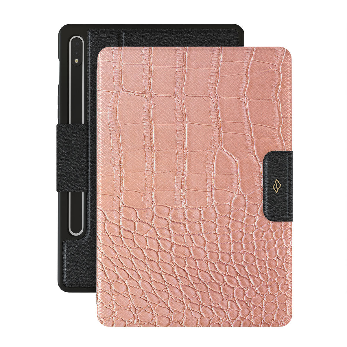 Our Pink Croco-it is a printed pattern * Samsung Galaxy Tab S8+/S7+/S7 FE folio case features a classic crocodile design reimagined and showcased in a soft coral shade. The new take on the dangerous animal print will add a touch of softness to your style while simultaneously offering heavy-duty protection to your device.
