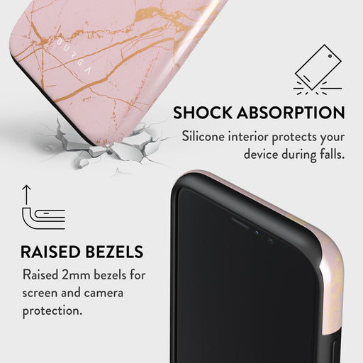 Growing under the beautiful sky and warmed by the rays of the sunshine, when ripped, peach offers you sweetness and softness. This is why our Peachy Gold iPhone 11 phone case design adds a bit of golden color to the pink marble dream making a protective phone case both pretty and durable.