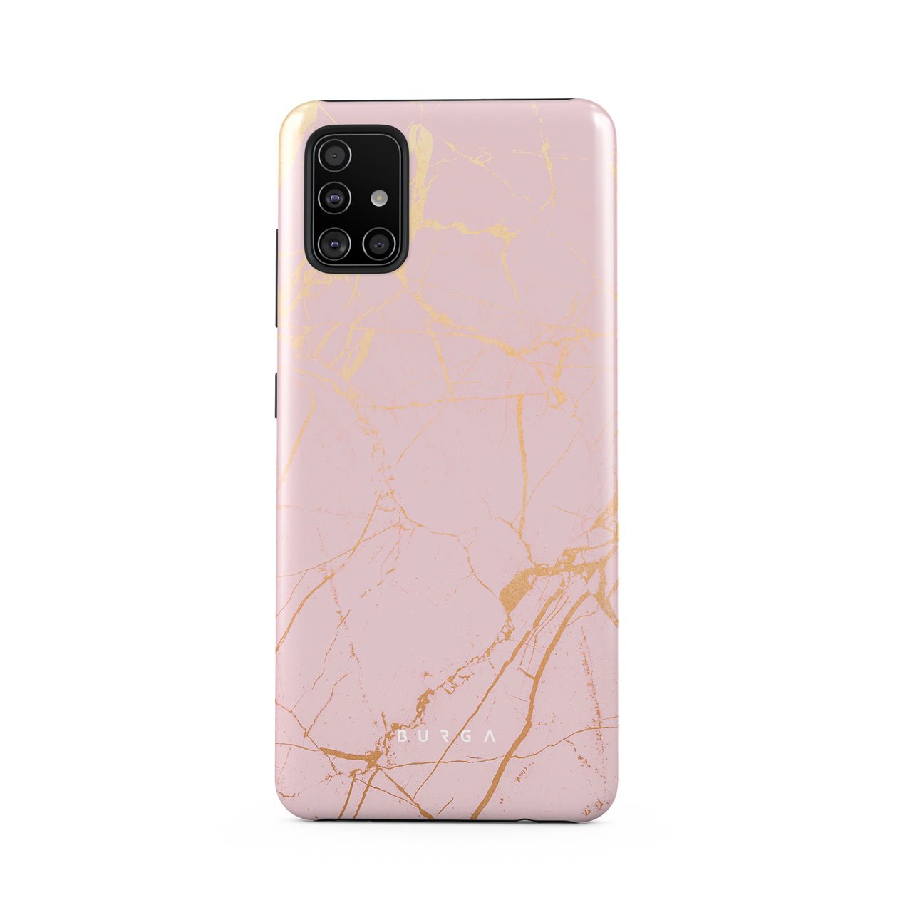 Growing under the beautiful sky and warmed by the rays of the sunshine, when ripped, peach offers you sweetness and softness. This is why our Peachy Gold Samsung Galaxy A71 phone case design adds a bit of golden color to the pink marble dream making a protective phone case both pretty and durable.