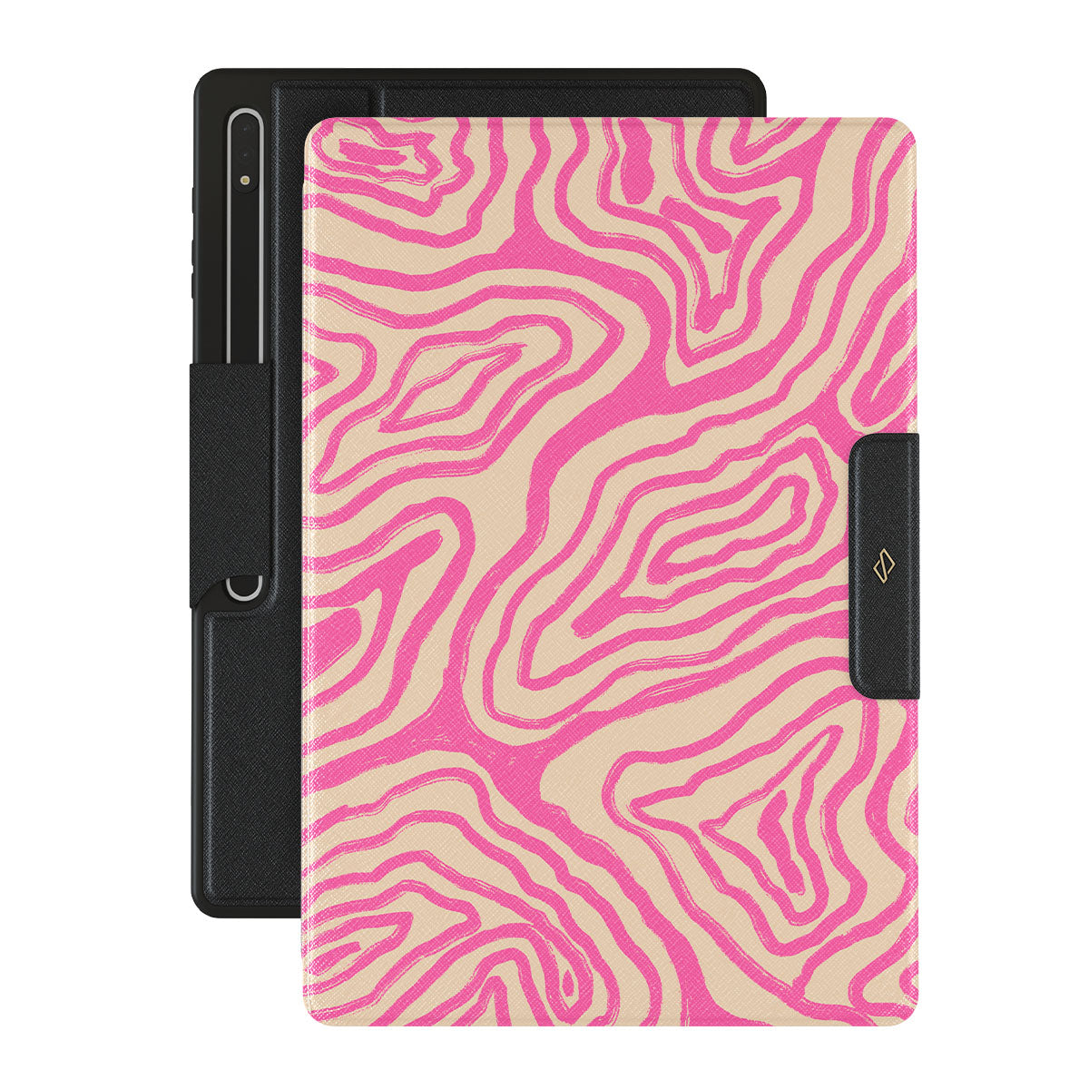 The Pink Shores Samsung Galaxy Tab S8 Ultra folio case features mesmerizing pink swirls on a cream background. This vibrant, beach-insipired pattern captures the serene beauty of sandy beaches kissed by soft pink waves. Perfect for those who love unique, ocean-inspired aesthetics.