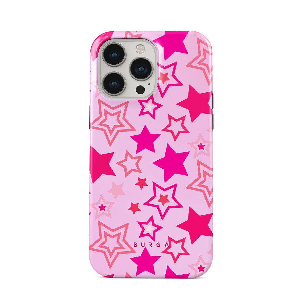 Buckle up for a starry ride, and let's twirl under the Plastic Sky. Neon stars shimmering across a cheeky rose-tinted galaxy create a playful space-disco atmosphere. Be the center of the universe with our Plastic Sky iPhone 13 Pro phone case!