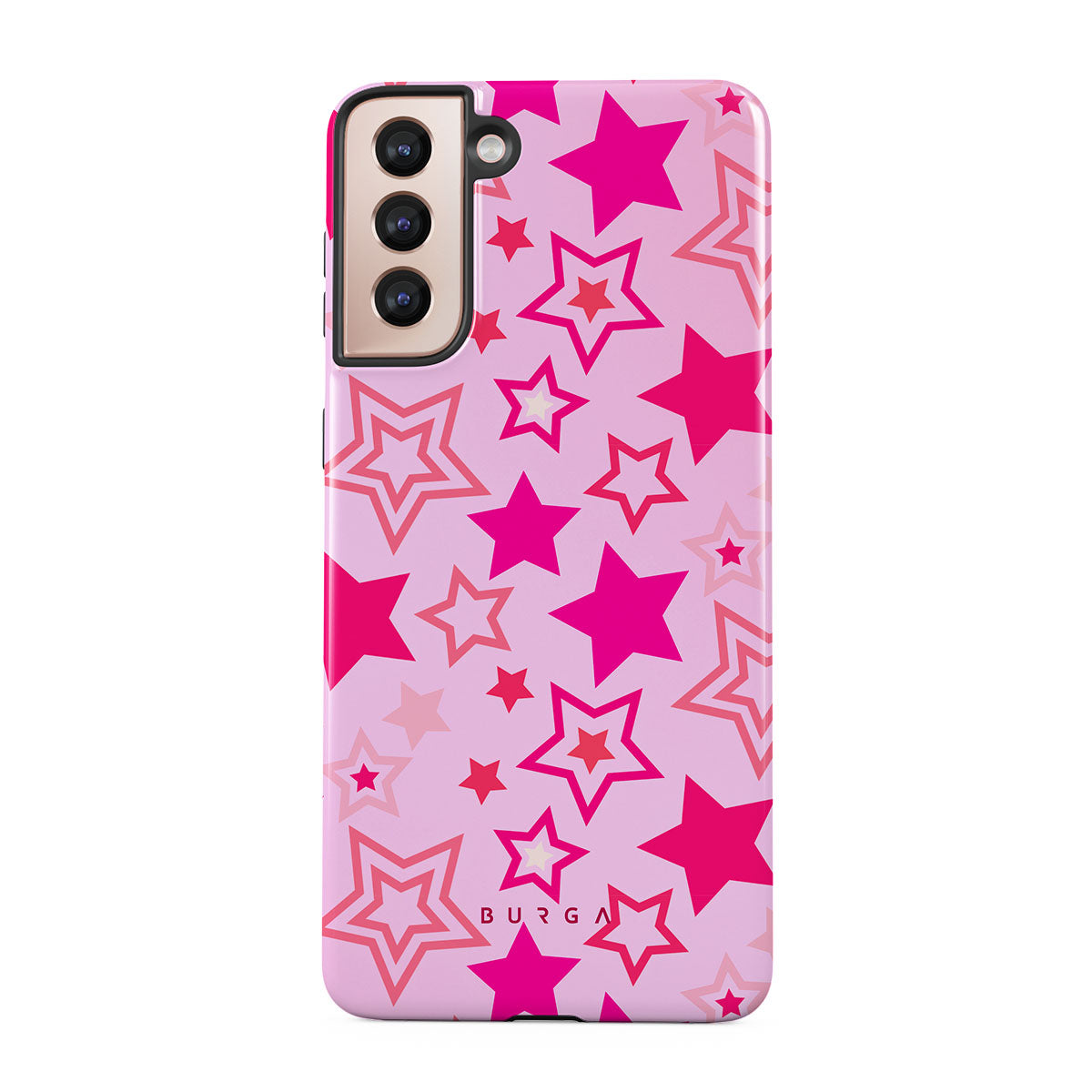 Buckle up for a starry ride, and let's twirl under the Plastic Sky. Neon stars shimmering across a cheeky rose-tinted galaxy create a playful space-disco atmosphere. Be the center of the universe with our Plastic Sky Samsung Galaxy S21 Plus phone case!