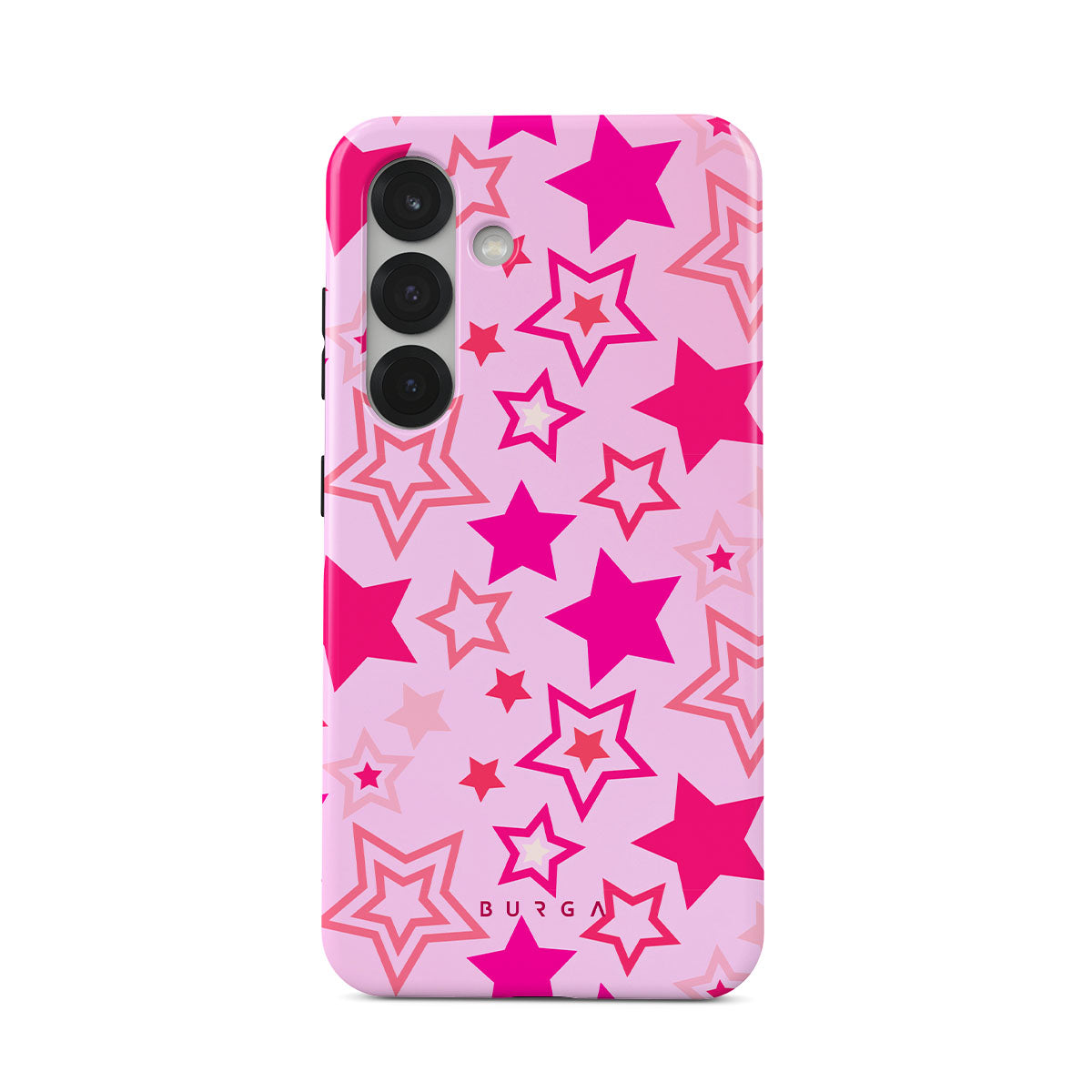 Buckle up for a starry ride, and let's twirl under the Plastic Sky. Neon stars shimmering across a cheeky rose-tinted galaxy create a playful space-disco atmosphere. Be the center of the universe with our Plastic Sky Samsung Galaxy S25 Plus phone case!