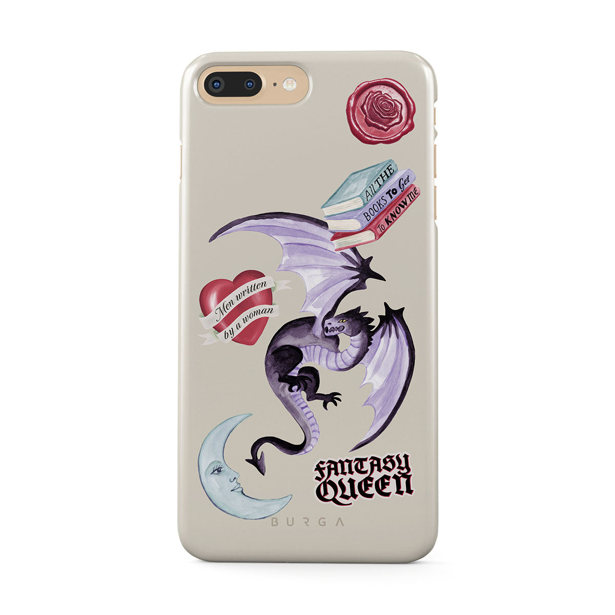 This design features: purple dragon, "Fantasy Queen" sticker, crescent moon, purple wax seal, heart with message, books