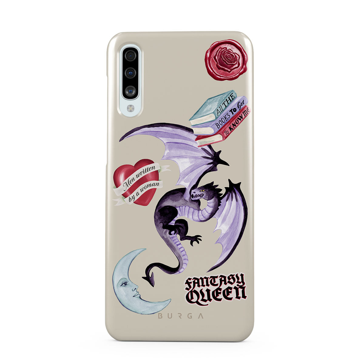 This design features: purple dragon, "Fantasy Queen" sticker, crescent moon, purple wax seal, heart with message, books