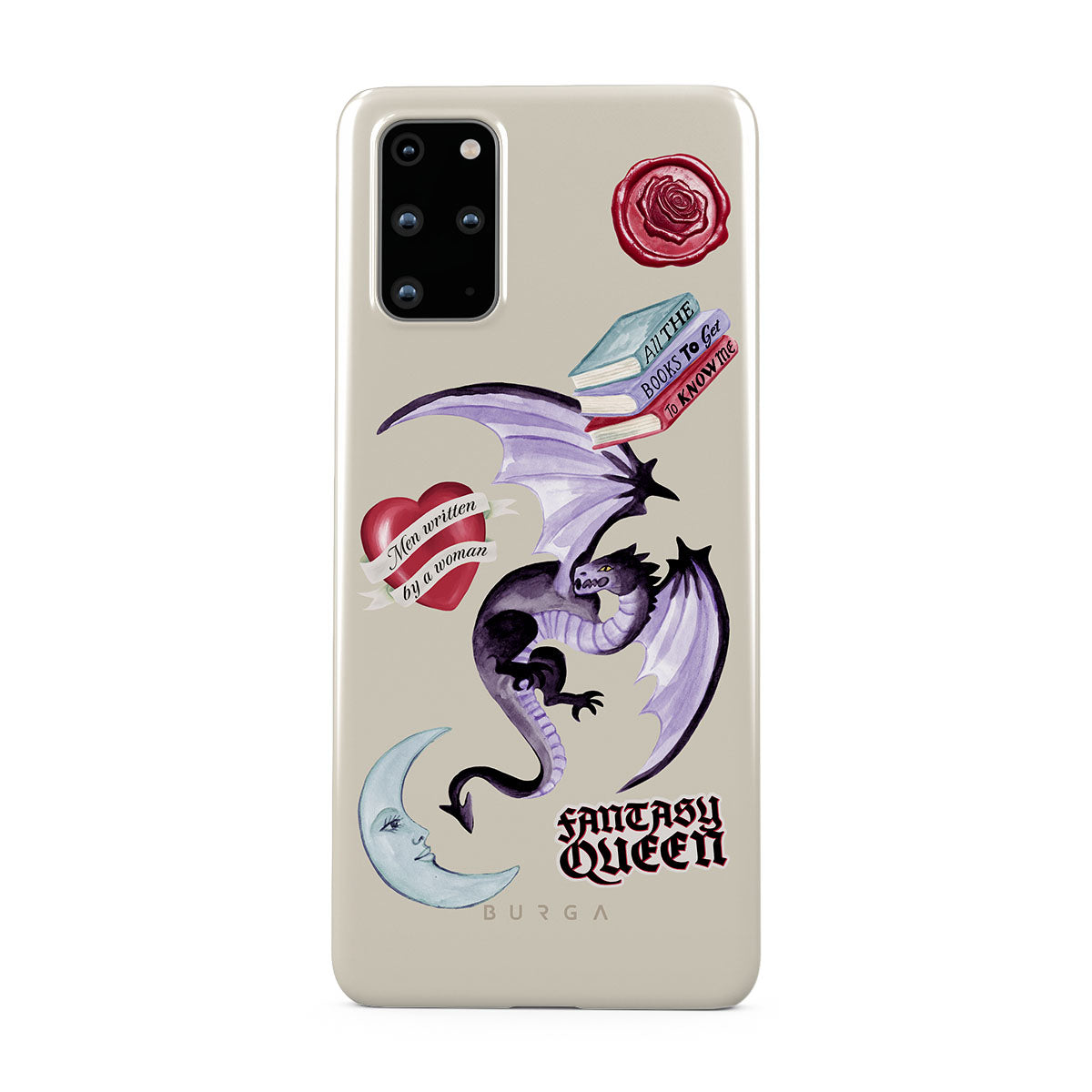This design features: purple dragon, "Fantasy Queen" sticker, crescent moon, purple wax seal, heart with message, books