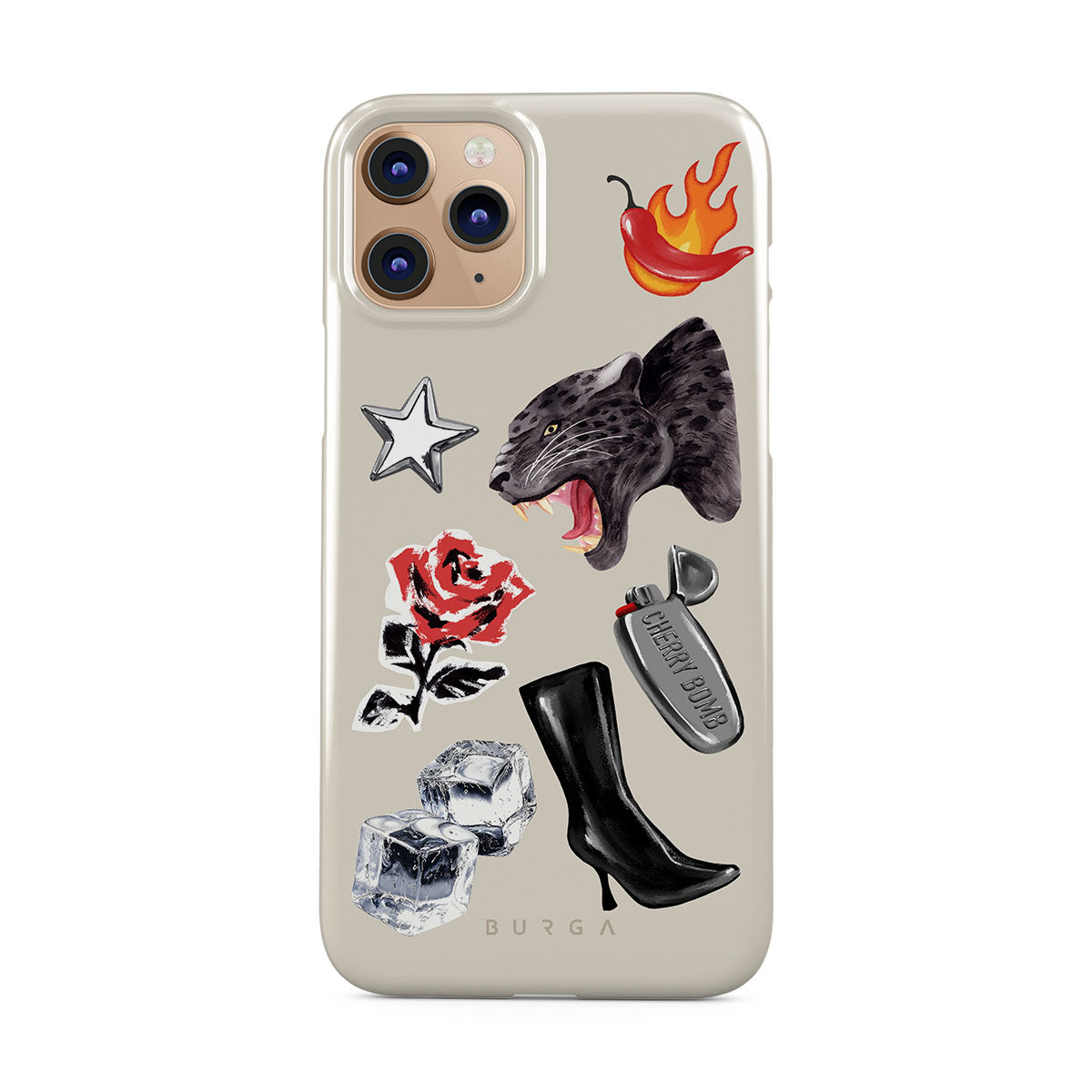 This design features: black panther, red rose, burning bell pepper, silver lighter, black knee-high boots, ice cubes, silver star
