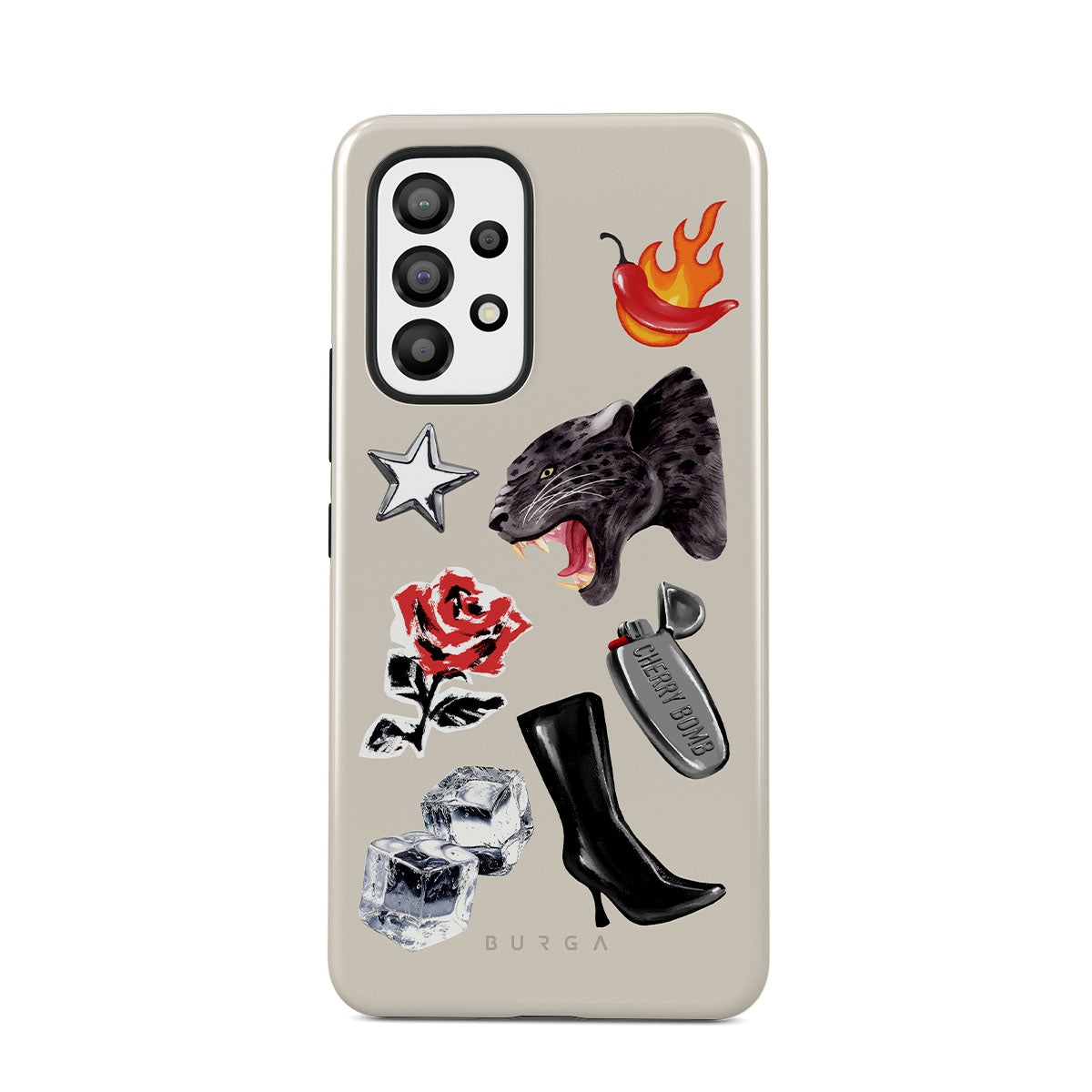 This design features: black panther, red rose, burning bell pepper, silver lighter, black knee-high boots, ice cubes, silver star