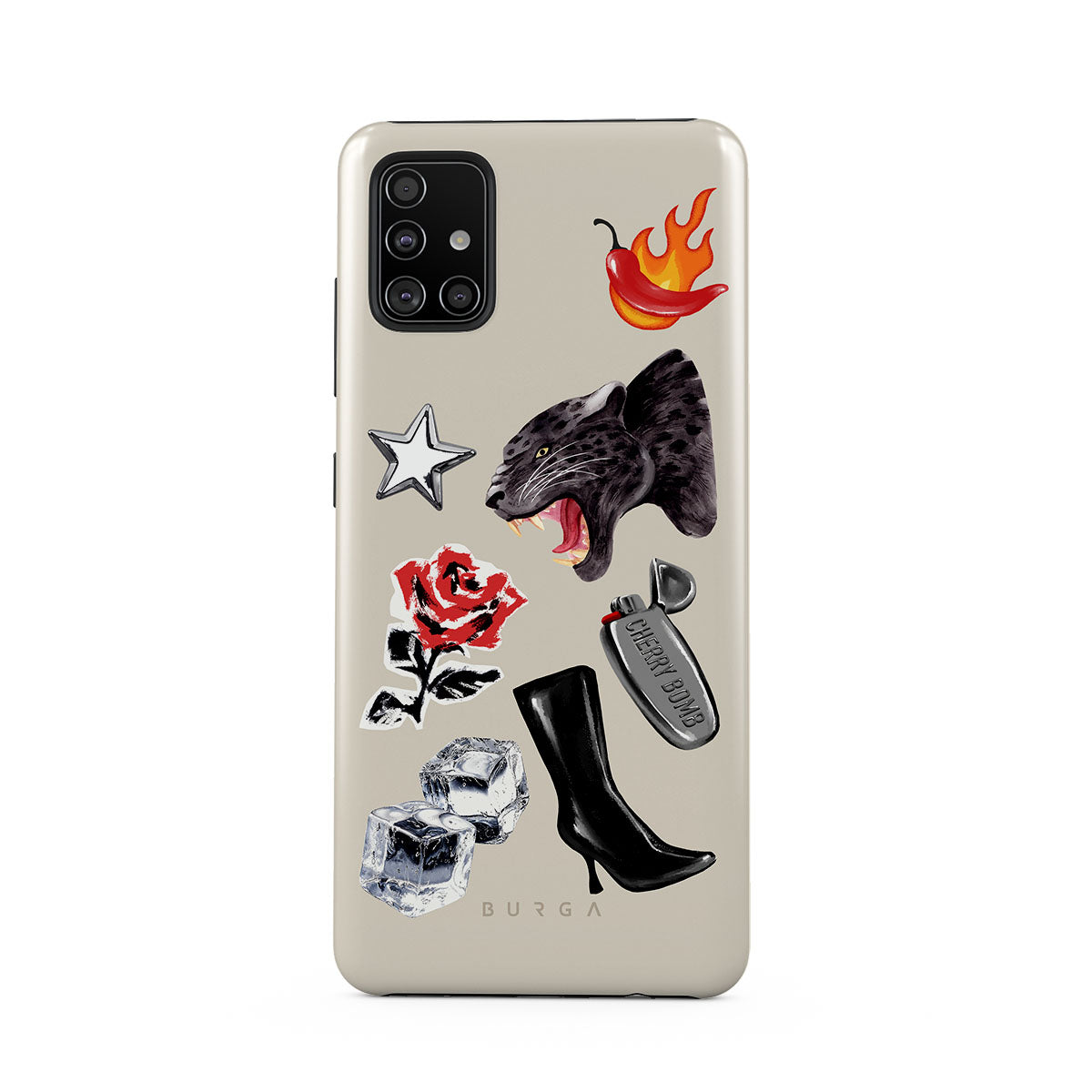 This design features: black panther, red rose, burning bell pepper, silver lighter, black knee-high boots, ice cubes, silver star