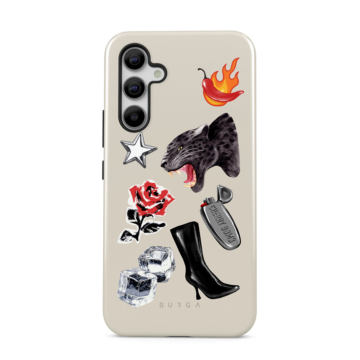 This design features: black panther, red rose, burning bell pepper, silver lighter, black knee-high boots, ice cubes, silver star