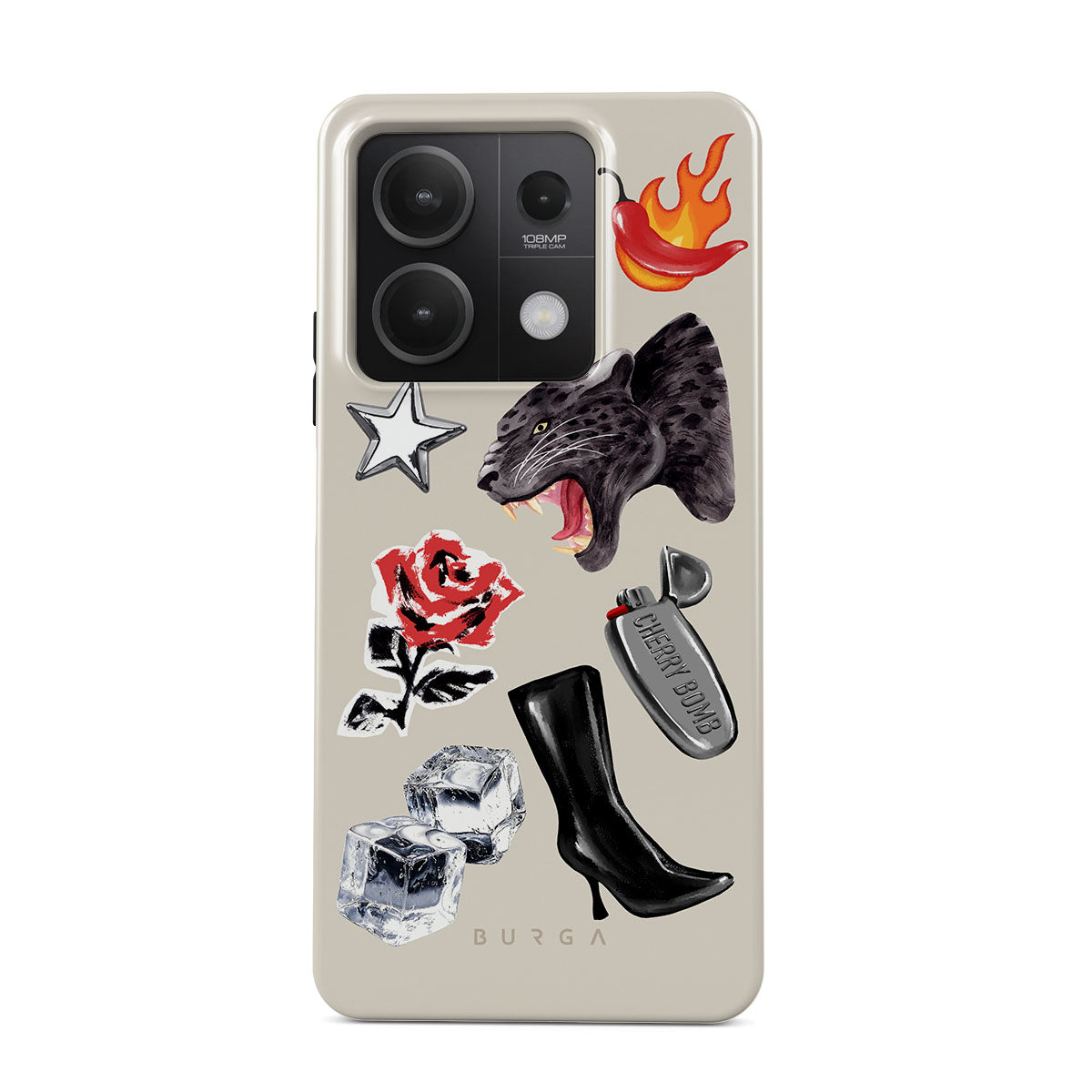 This design features: black panther, red rose, burning bell pepper, silver lighter, black knee-high boots, ice cubes, silver star