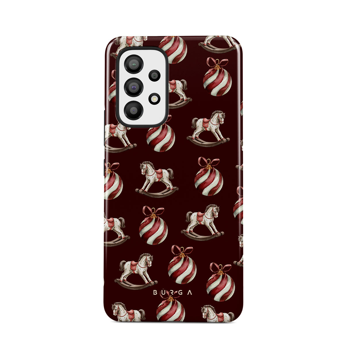 Jingle all the way with this playful Samsung Galaxy A73 phone case design. Featuring rocking horses and candy-striped bells, our Rocking Around design transports you back to childhood moments of decorating the tree and waiting for Santa. It’s the ultimate throwback to vintage Christmas charm.