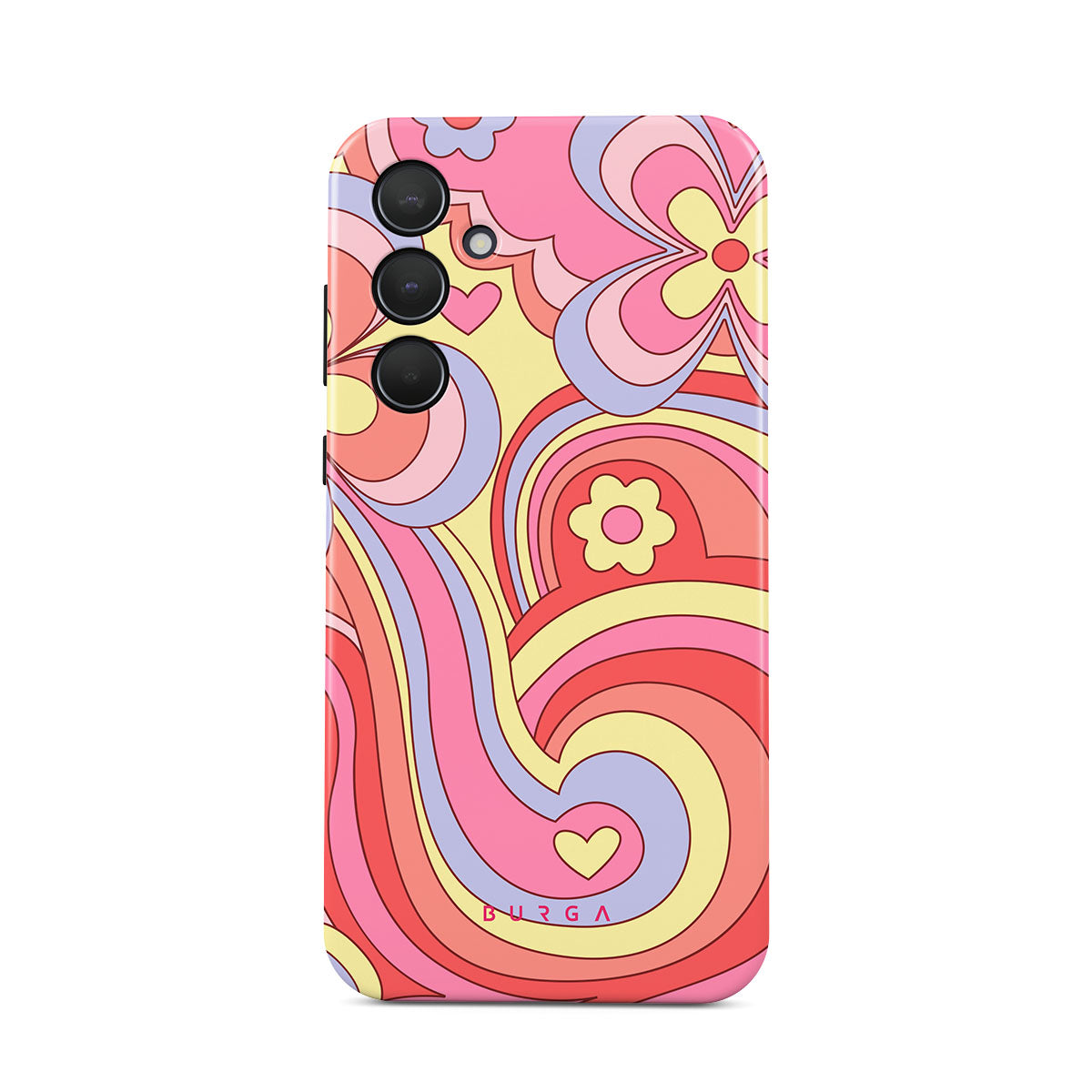 A design embodying a radiant, cheerful life filled with hope and joy. A celebration in hues, a mix of vibrant pink, yellow, and blue swirls. Roller Disco is where fashion meets fun. With beautiful pastels blending into a head-turning style, every day feels like a party. Spin your Samsung Galaxy A35 phone case into the spotlight!