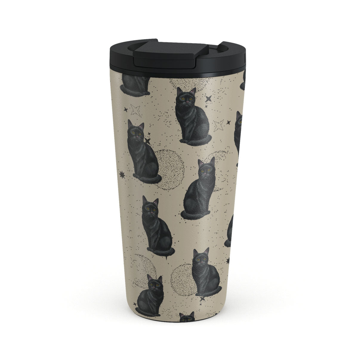This design features: black cats, mystical symbols
